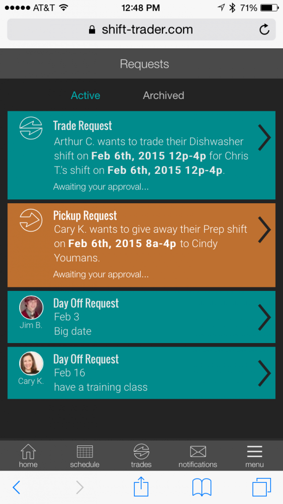 Shift Agent streamlines your management of requests for changes from your employees. As a manager, you have a requests management area in your menu, both on the mobile view as well as on the computer/tablet view. Your response to these requests and affect changes to the schedule by inputting your decisions about trades and days off.